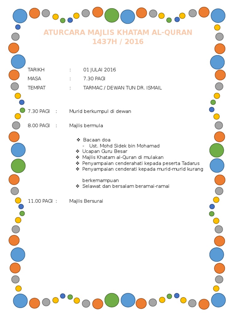 Pihak sekolah berbesar hati menjemput datok / datin / encik / puan / cik hadir ke majlis tersebut seperti butiran. Mejar (k) dato haji abd rahman bin ismail, mantan pengarah jabatan hal ehwal agama islam negeri kedah. Teks pengacaraan majlis khatam al 1. About press copyright contact us creators advertise developers terms privacy policy & safety how youtube works test new features press copyright contact us creators. Majlis ini telah dirasmikan oleh ybhg.