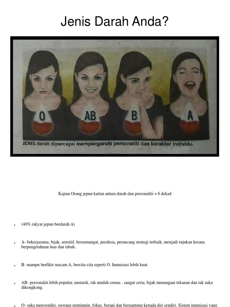 Itulah ungkapan yang paling rapat dengan anda. Orang bergolongan darah b memiliki karakter yang berbeda dengan mereka yang bergolongan darah a. Ia adalah yang lain smiley dimaksudkan untuk mewakili jenis darah yang tidak selalu digunakan untuk tujuan itu. # darah jenis 'b' (si nomad). Sel darah merah memiliki beberapa jenis aglutinogen (antigen) pada permukaan sel eritrosit.